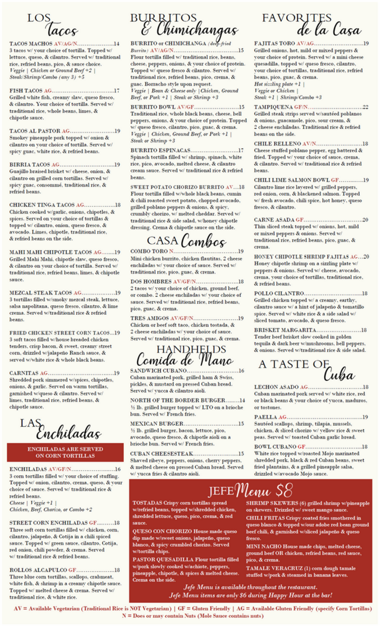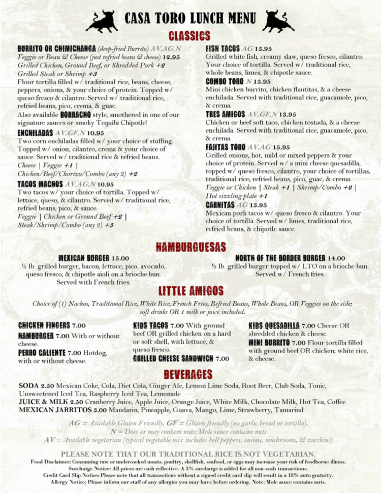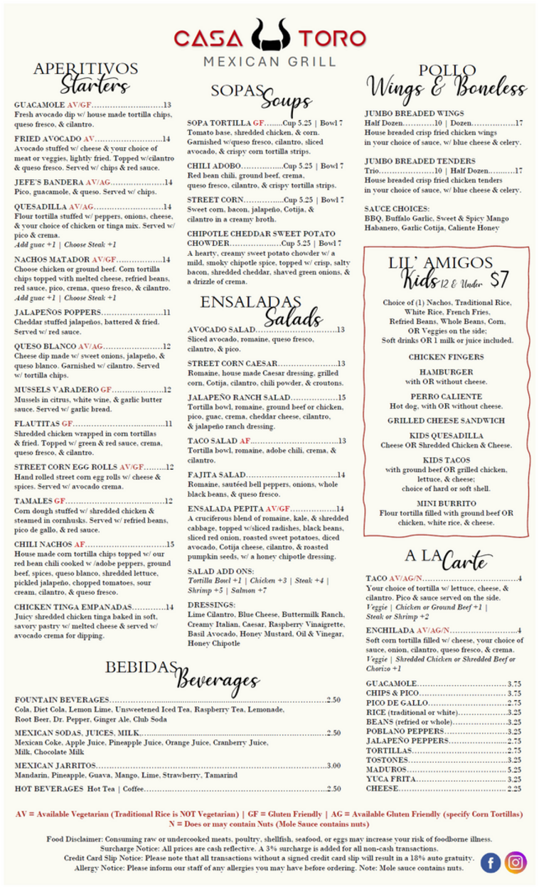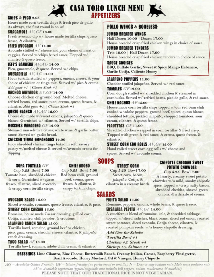 CASA TORO COOPERSBURG MENU